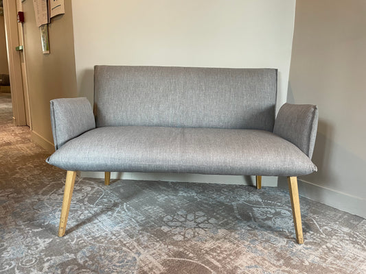 Banquette deux personnes avec accoudoirs, en tissu gris, pieds en bois avec quelques traces.