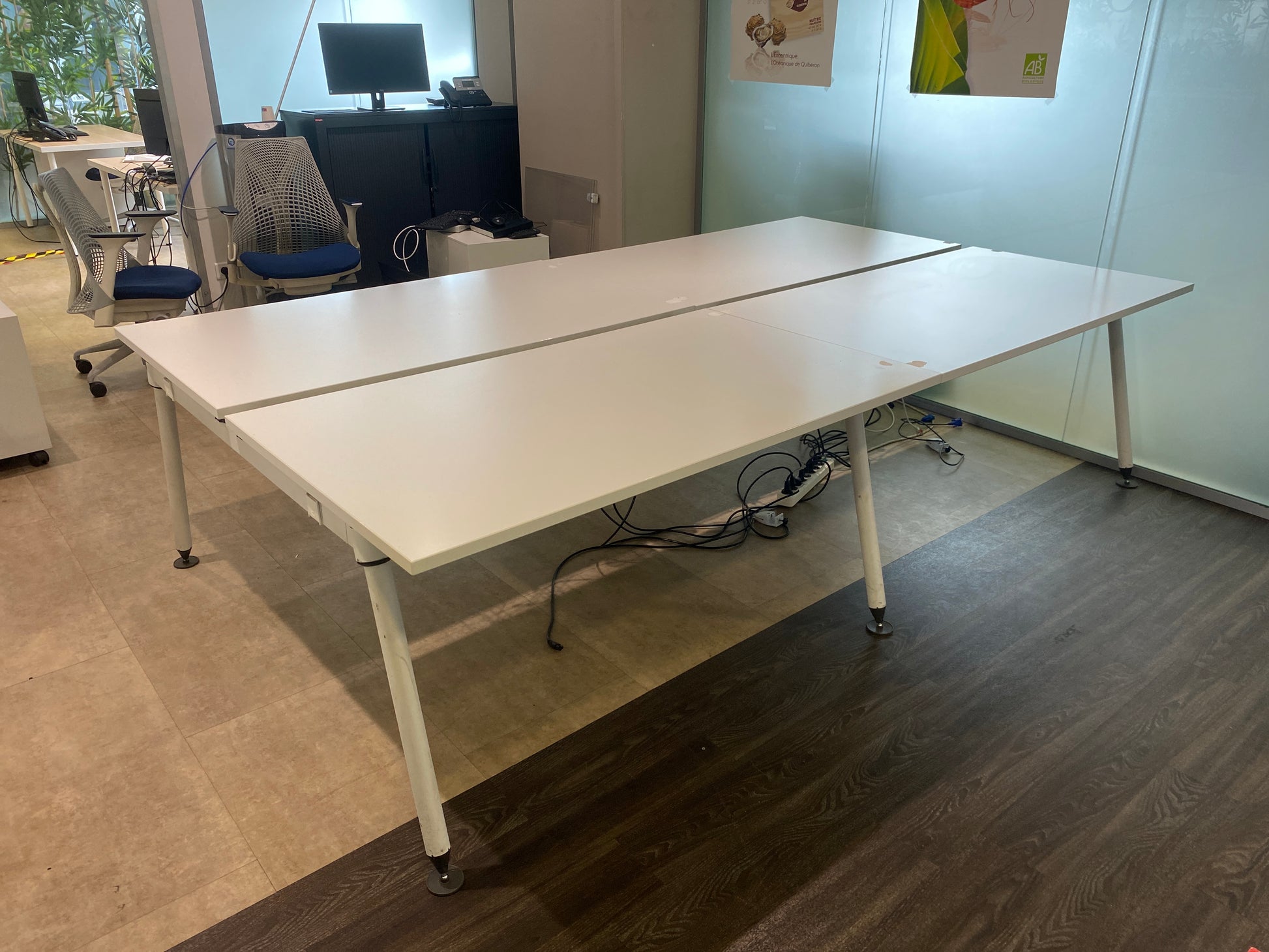 Bureau multiposte avec 2 postes, dimensions de 140x165x70 cm. Le plateau en bois est de couleur blanc, soutenu par des pieds en métal également de couleur blanc. Équipé d'une goulotte pour le passage des câbles. Marque : Herman Miller. Les accoudoirs ne sont pas inclus.